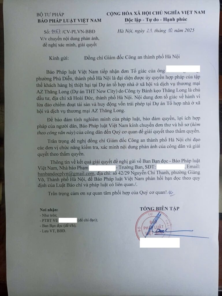 Ngày 21/10/2025, Báo Pháp luật Việt Nam – cơ quan thuộc Bộ Tư pháp – đã ban hành Công văn số 1467/CV-PLVN-BBD gửi Công an TP. Hà Nội, đề nghị xem xét, xác minh các nội dung phản ánh của tập thể khách hàng về hoạt động giao dịch tài chính tại Dự án Nhà ở Xã hội và Dịch vụ Thương mại AZ Thăng Long (THT – New City) do Công ty TNHH Bánh kẹo Thăng Long làm chủ đầu tư.