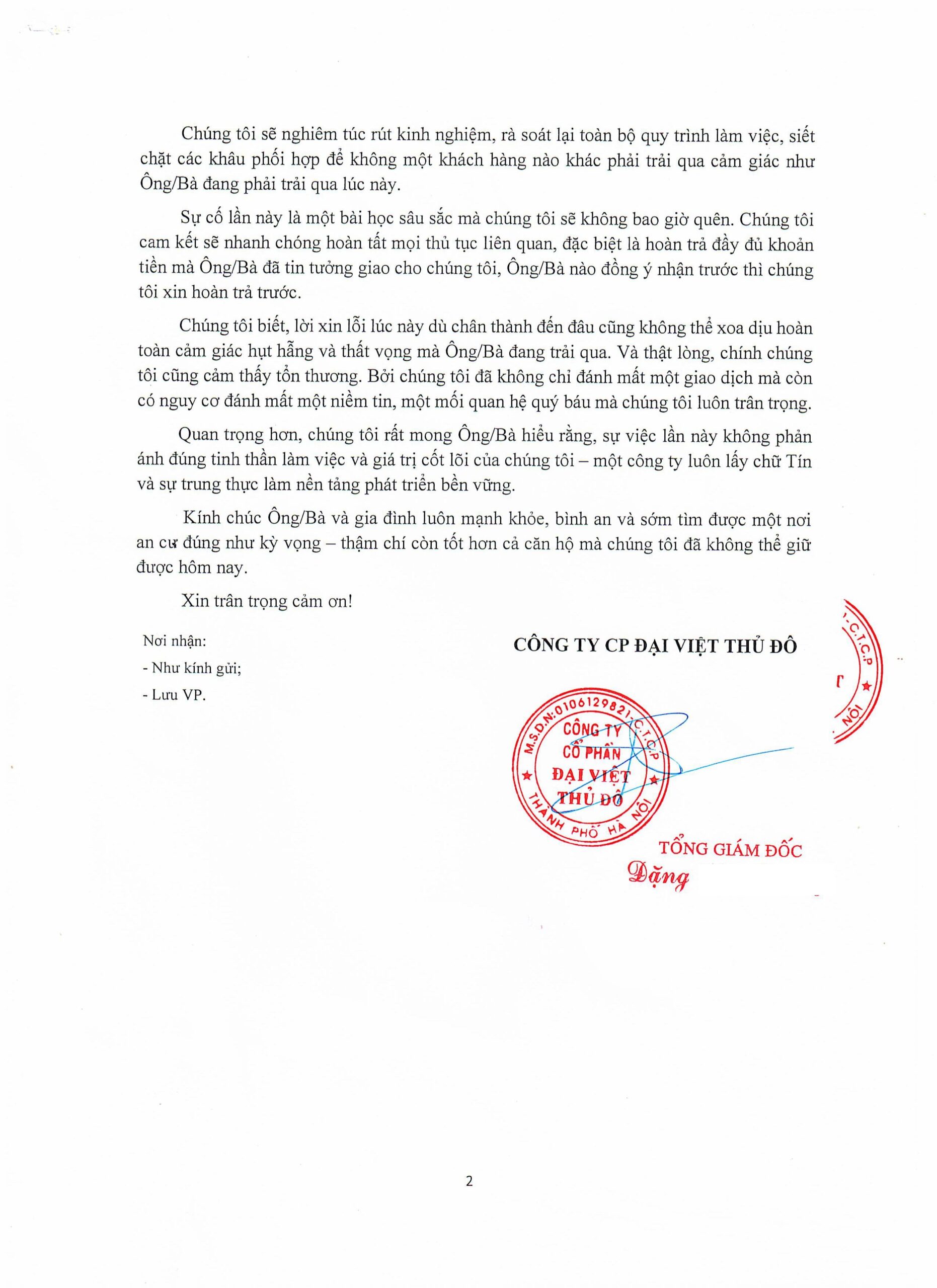 Công ty Cổ phần Đại Việt Thủ Đô: xác nhận không thể tiếp tục giữ quyền thuê/mua căn hộ do thiếu hồ sơ bàn giao từ cán bộ, nhân viên cũ; đồng thời hứa sẽ rà soát, hoàn tiền cho khách hàng có liên quan.