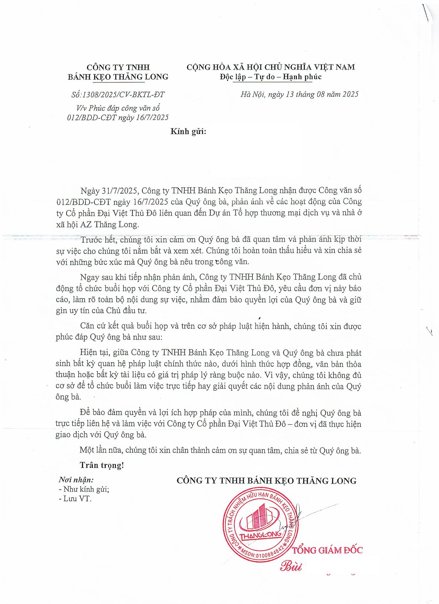 Công ty TNHH Bánh Kẹo Thăng Long (Chủ đầu tư dự án): Dù đã tiếp nhận bộ hồ sơ của khách hàng và theo thông tin của cán bộ lãnh đạo của Sàn Đại việt Thủ đô trước kia cho biết rằng số tiền mà khách hàng đặt cọc đã được chuyển cho Chủ đầu tư, thì nay Chủ đầu tư ra văn bản trả lời rằng hiện chưa phát sinh quan hệ pháp lý chính thức với các khách hàng, do chưa có hợp đồng hay văn bản thỏa thuận mang giá trị pháp lý ràng buộc.
