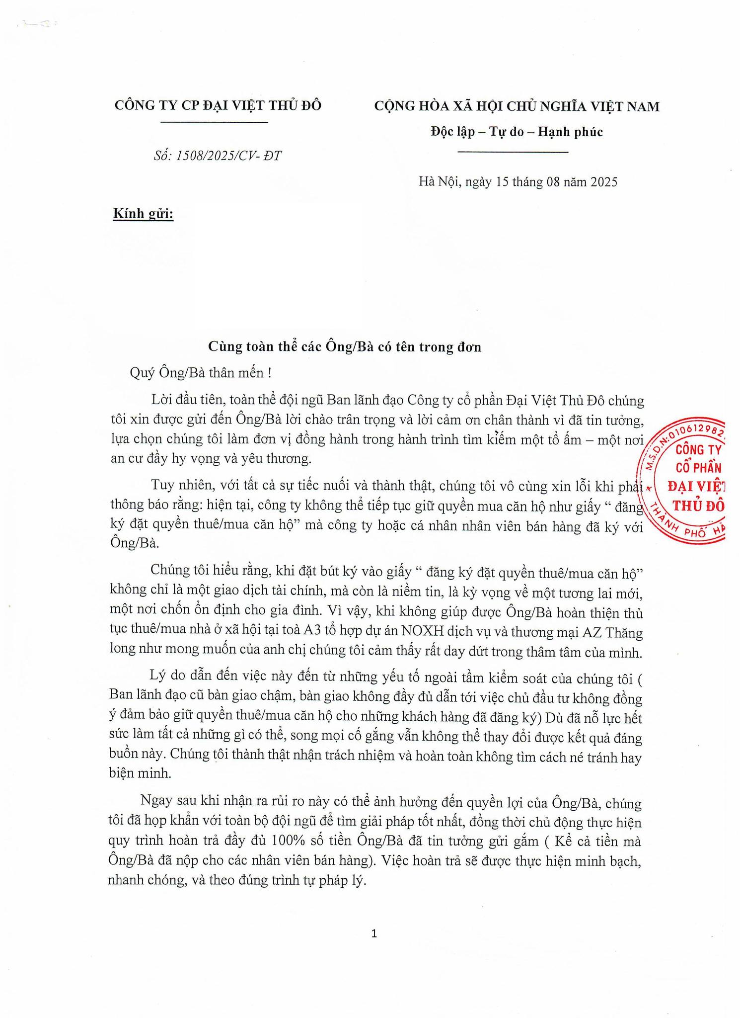 Công ty Cổ phần Đại Việt Thủ Đô: xác nhận không thể tiếp tục giữ quyền thuê/mua căn hộ do thiếu hồ sơ bàn giao từ cán bộ, nhân viên cũ; đồng thời hứa sẽ rà soát, hoàn tiền cho khách hàng có liên quan.